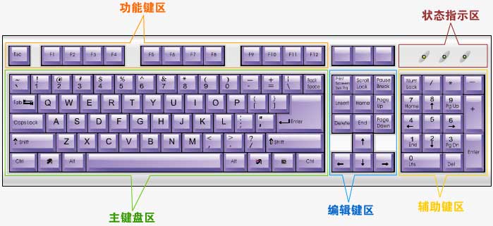 整个键盘分为五个小区:上面的一行,是功能键区和状态指示区;下面的五行是主键区、编辑键区和辅助键区。